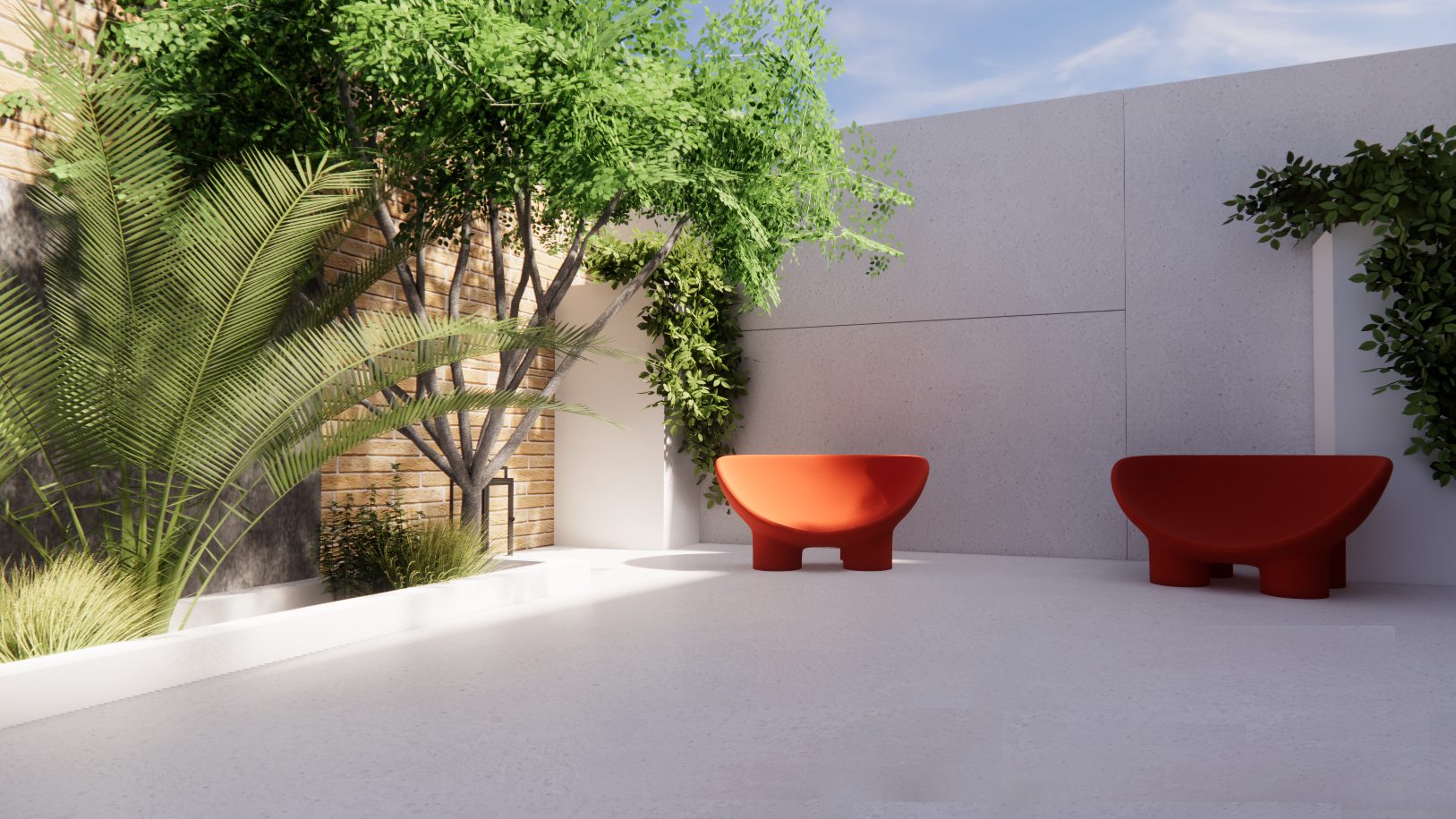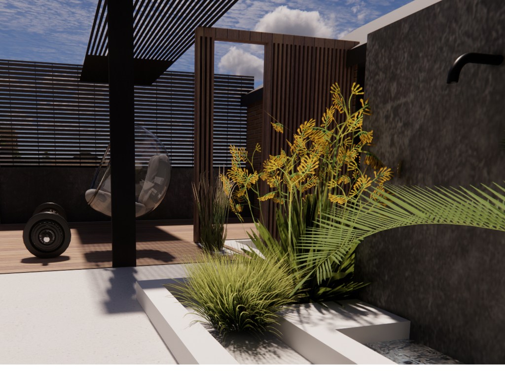 The brief was for a holiday Ibiza vibe garden-style. Not all arid climate plants will grow in the UK, therefore the desired vibe had to be achieved through minimalistic design and stone / textured concrete and decking finishes. The brief also requested an exercise area, storage, gathering area, and shelter possibly from the neighbors above.