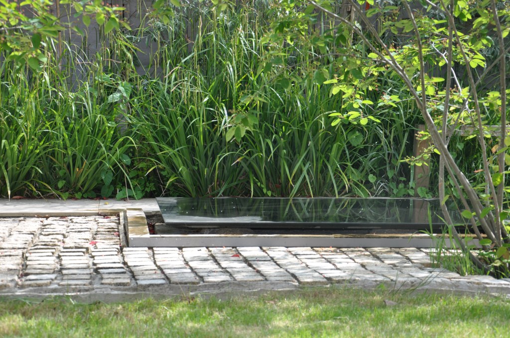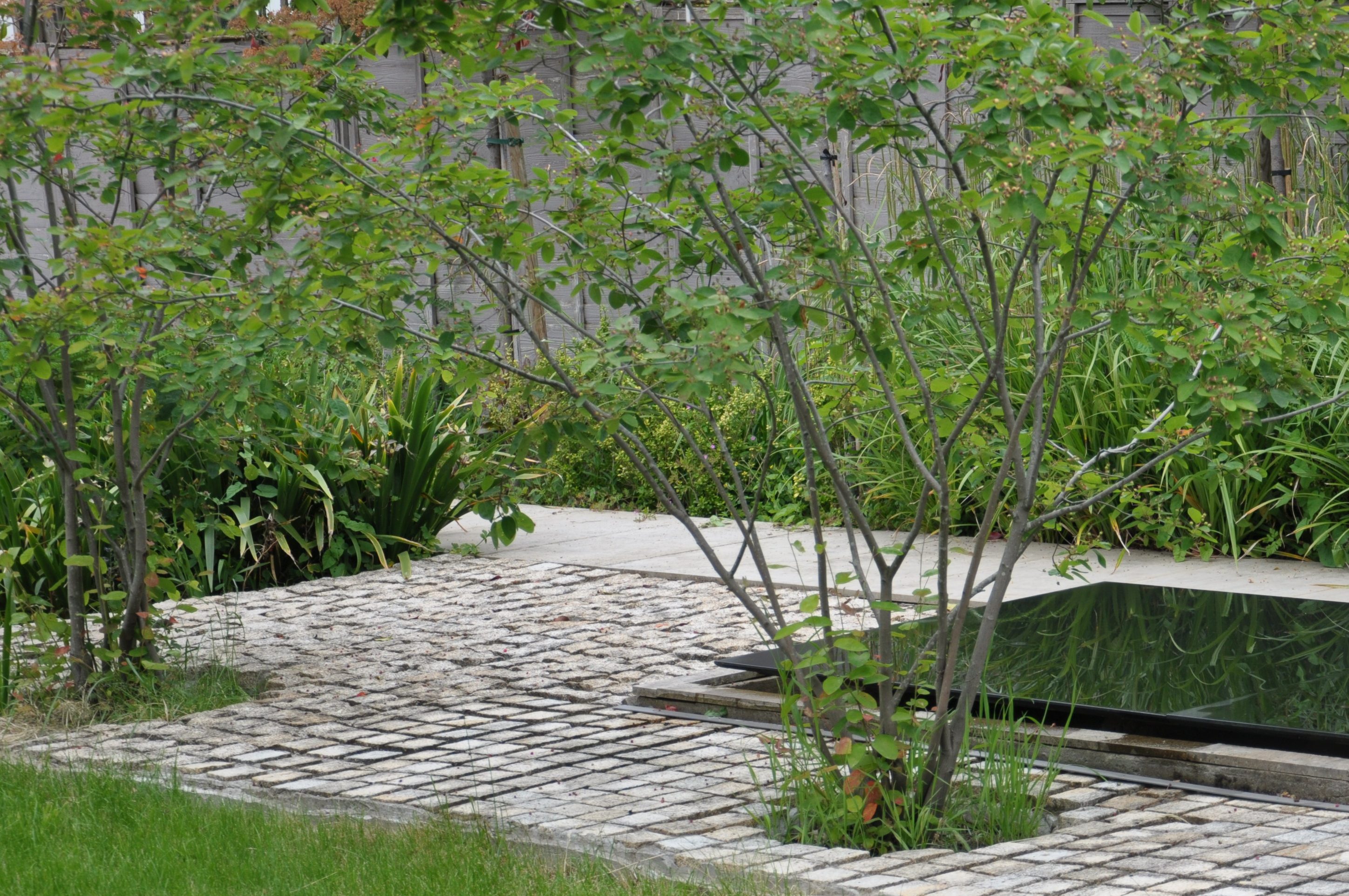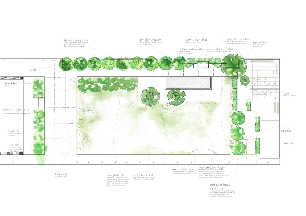 The client required a classic contemporary garden. The design formed linear perspective layouts and structure, layering long lines of vegetation at different heights. The centerpiece of the garden design is a large granite water feature, with a surrounding of cobbled paving and two Amelanchier Lamarckii trees that create a strong sculptured look, creating a strong perspective view. There are two patios-one accessible directly from the patio doors, another further at the back hosting a firepit.
